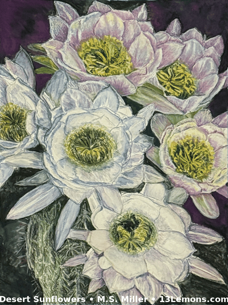 Shop Desert Sunflowers by M.S. Miller, a fine art cactus flower painting in oil pastel. Limited edition desert botanical prints available at 13 Lemons.