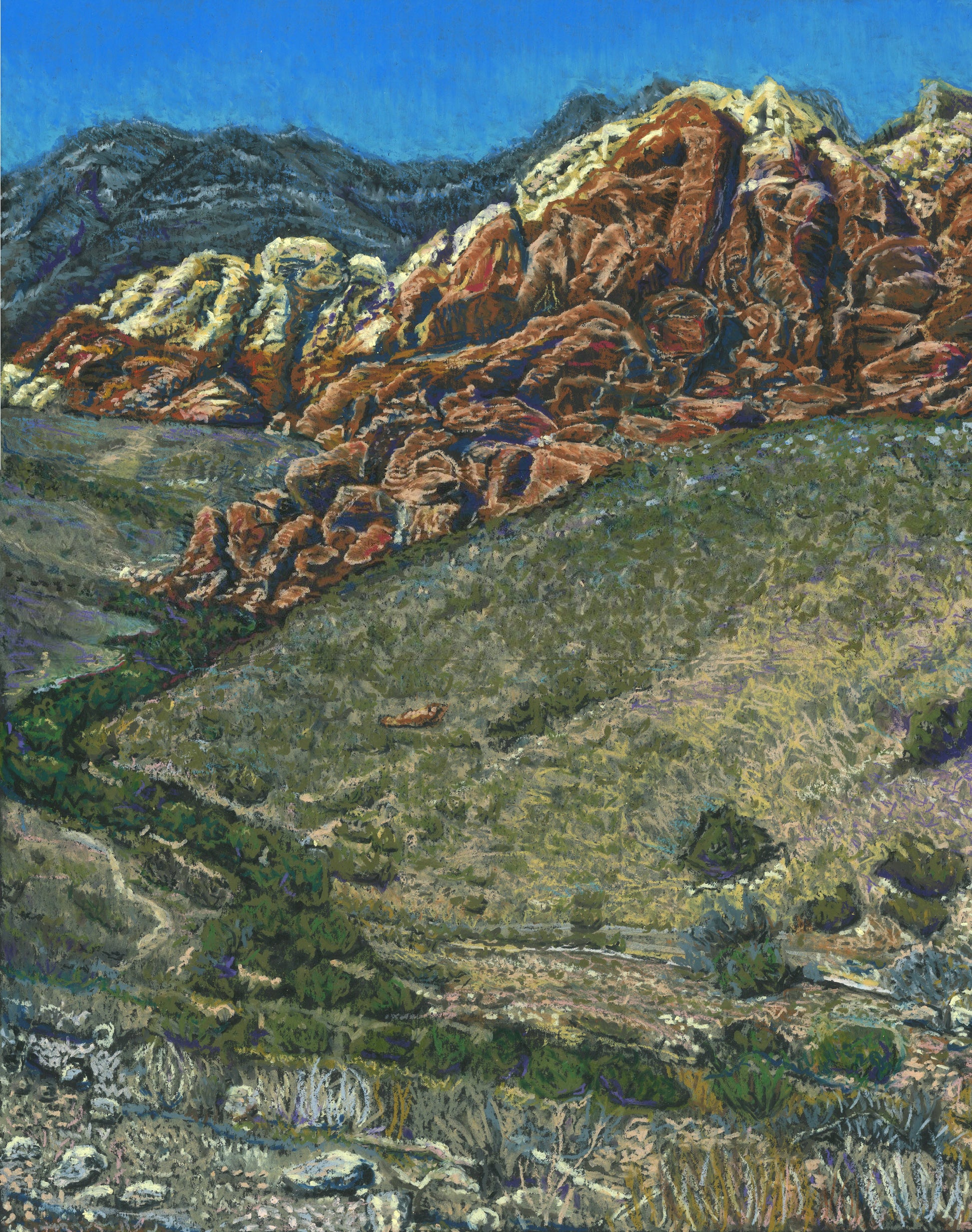 Experience the dynamic interplay of life and aridity in Red Rock Canyon, a masterful work by contemporary American impressionist artist M.S. Miller. This oil pastel captures the striking beauty of Red Rock Canyon in a rare wet spring, blending earthy red sienna, golden yellow ochre, soft greys, vibrant greens, and tranquil blues. The sweeping textures and fluid strokes evoke the rebirth of spring amidst the stark dryness of the Mojave Desert.