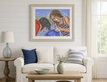Wonder captures a fleeting moment of discovery between two children exploring a tidepool along the shores of Chatham, Massachusetts. This original mixed media artwork draws viewers into the quiet magic of childhood wonder and curiosity. The vibrant stripes of the girl’s swimsuit and the brilliant red of her friend’s shirt pop against the delicate blues and greens of the tidepool, offering a colorful pastel painting of childhood wonder that is perfect as coastal wall decor for a living room or beach house.